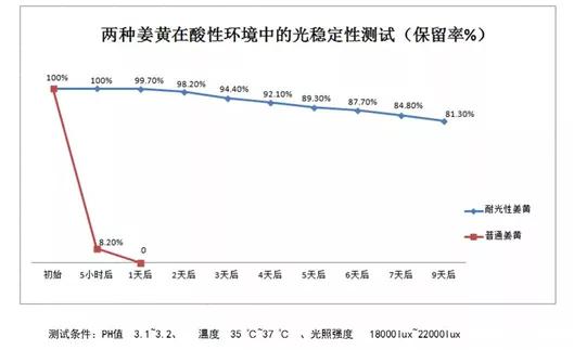 The retention rate of active ingredients in Purcurmin? turmeric of CUHK is still 81.30% after standing for 9 days in the test of light resistance and acid and alkali resistance;